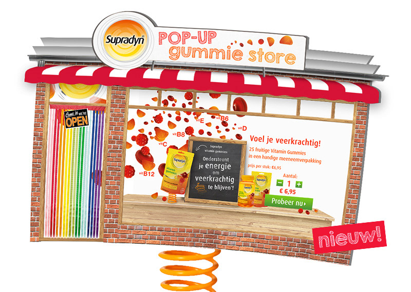 Design a spring-operated (popping-up) pop-up store for vitamin gummies.